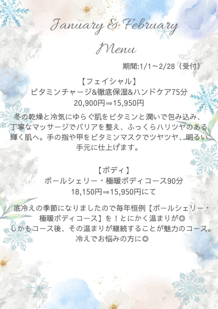 【1・2月限定】おすすめコースのご案内~⚘ 投稿日 2025年12月30日 著者 esthe-ku カテゴリー マンスリーコース カテゴリー お知らせ 1月2月は寒さが底冷えとなりますので、お肌は寒さや風に負けないトラブルの起きにくいお肌に仕上げる マルチビタミンコース ボディコースは体を芯から温める・ポールシェリーの極暖ボディコースです☻ 是非ご体感くださいませ~ ポールシェリー 都度払い 人気 小顔 ほうれい線 ダーマロジカ